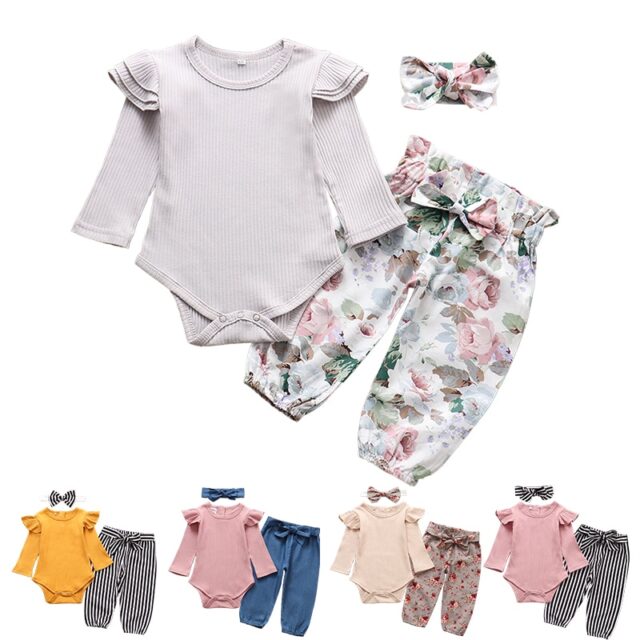 Baby Girls Long Sleeve Romper Pants Hairband Set